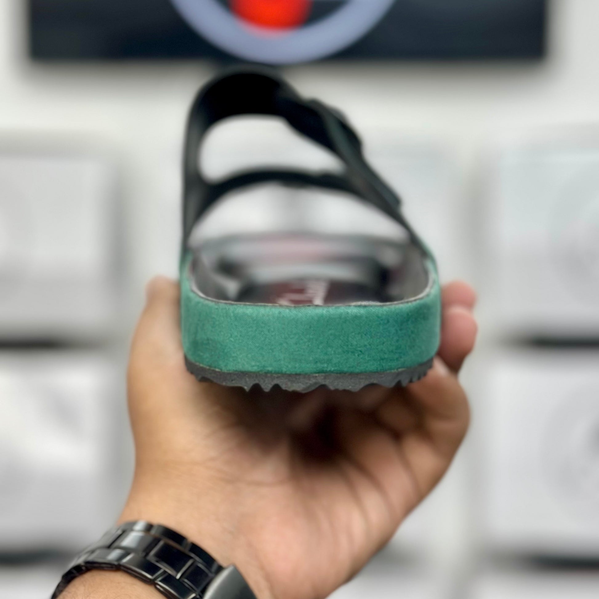 The shoe features a soft, suede-look upper in a deep green that sets it apart from typical casual footwear. The two adjustable matte-black buckles not only add a stylish contrast but also ensure a perfectly snug fit. Paired with a contoured, shock-absorbing footbed and a durable black outsole, this slide offers maximum comfort for all-day wear while keeping your look fresh and modern.